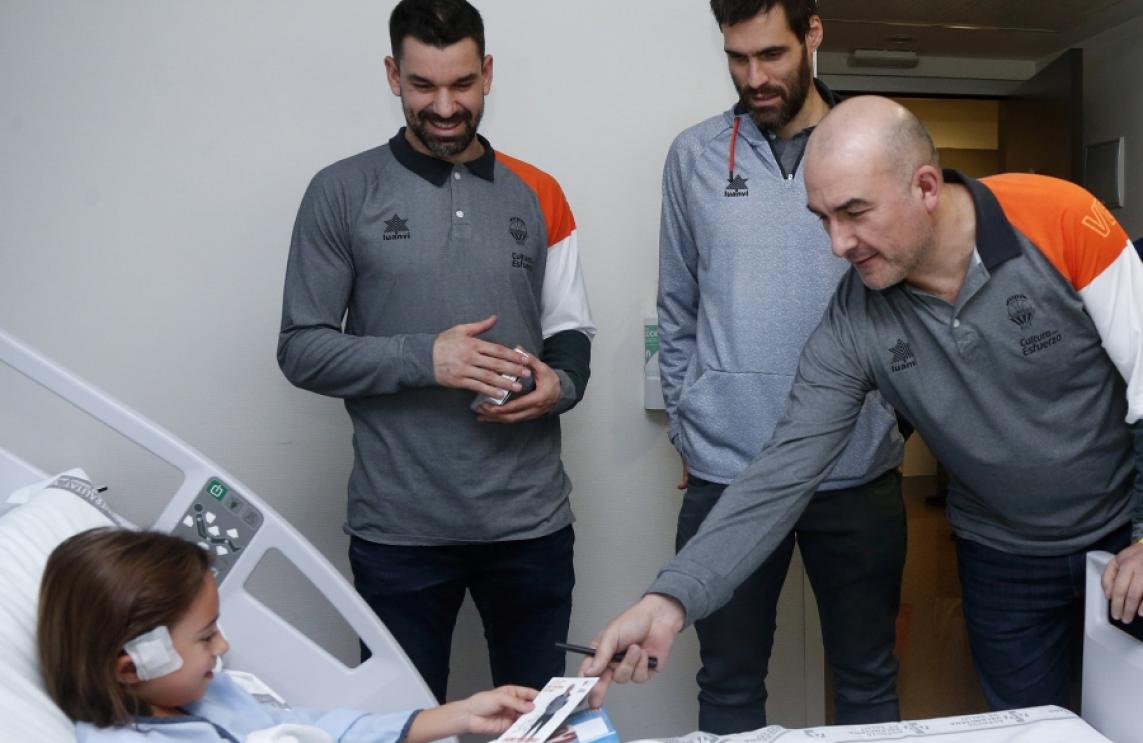La primera plantilla masculina del Valencia Basket junto con el entrenador Jaume Ponsarnau y el presidente Vicente Solá han visitado esta mañana, como es tradicional cada año en estas fechas, a los niños y niñas ingresados en las secciones infantiles de los hospitales La Fe y Dr. Peset de Valencia.
