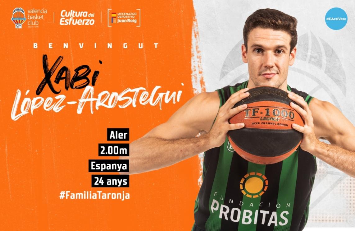 Valencia Basket ha aconseguit un acord per a incorporar a la seua primera plantilla masculina a l'aler internacional espanyol Xabi López-Arostegui (2.00m, Getxo, 19/05/1997, 24 anys) per a les pròximes 4 temporades, fins al 30 de juny de 2025. El jugador prové del Club Joventut Badalona i va ser designat com el Millor Aler de la passada temporada en la Liga Endesa i membre del Millor Quintet de la acb després d'una campanya en la qual va presentar uns números de 12,1 punts, 4,8 rebots i 1,2 recuperacions per a una mitjana de 14,1 crèdits de valoració, uns números que li van convertir en el jugador nacional més valorat de la Liga Endesa. Les seues prestacions van ser fins i tot lleugerament millors en la 7DAYS Eurocup, amb uns números de 12,3 punts, 4,9 rebots i 1,3 assistències per a 14,7 crèdits de valoració.